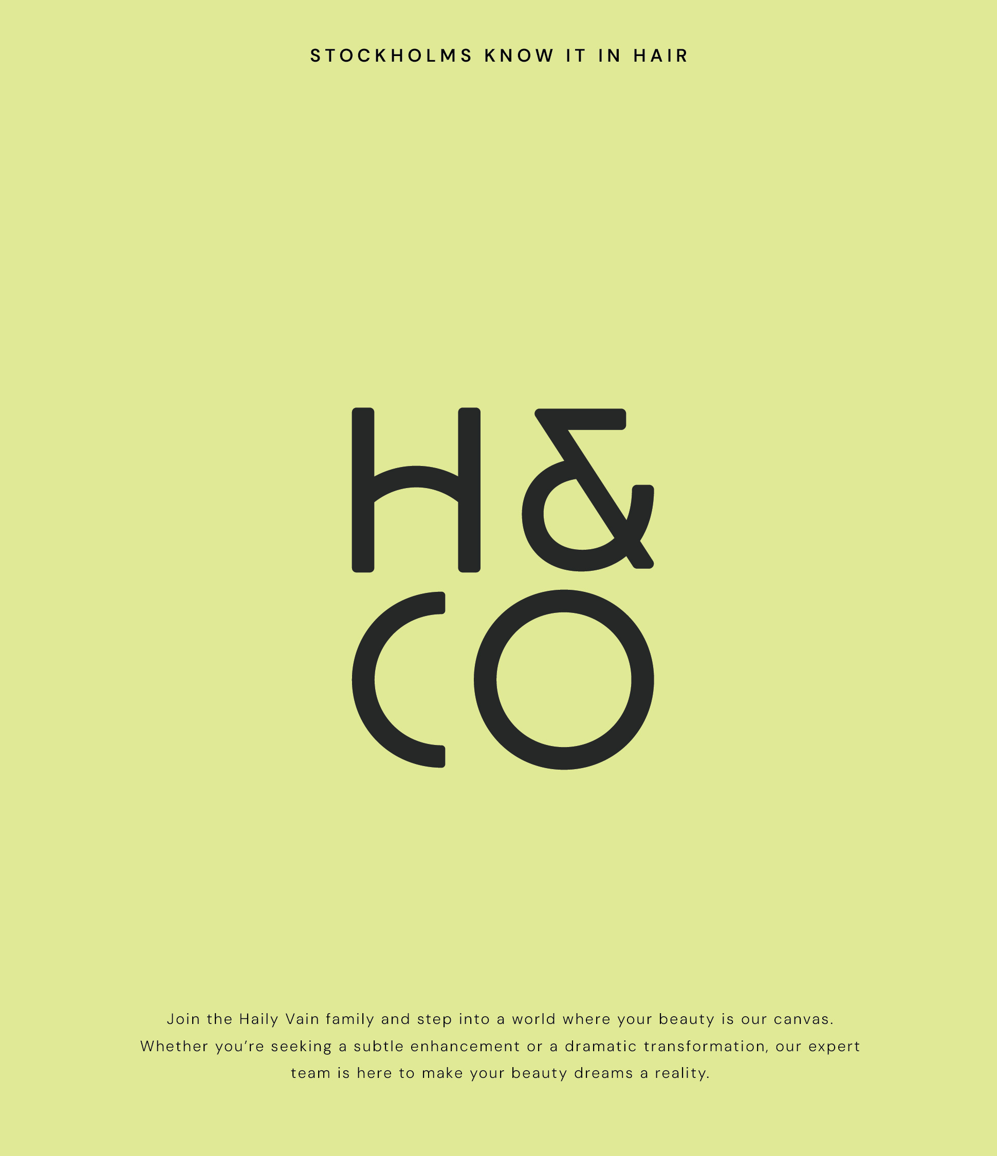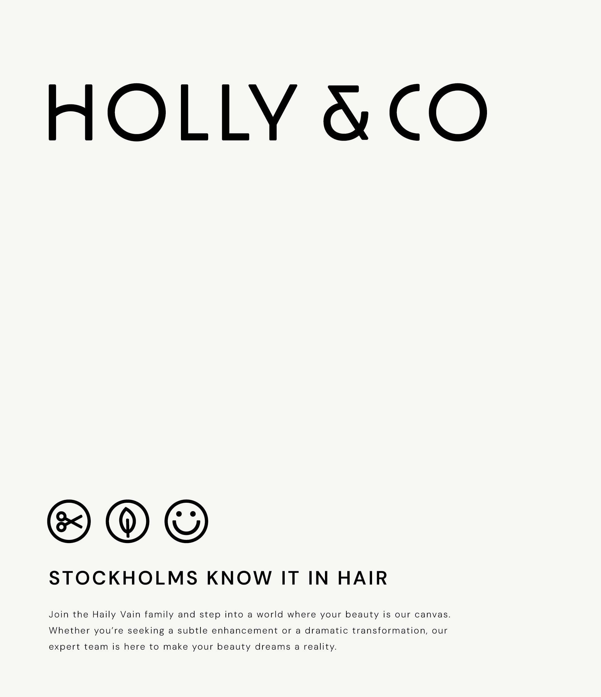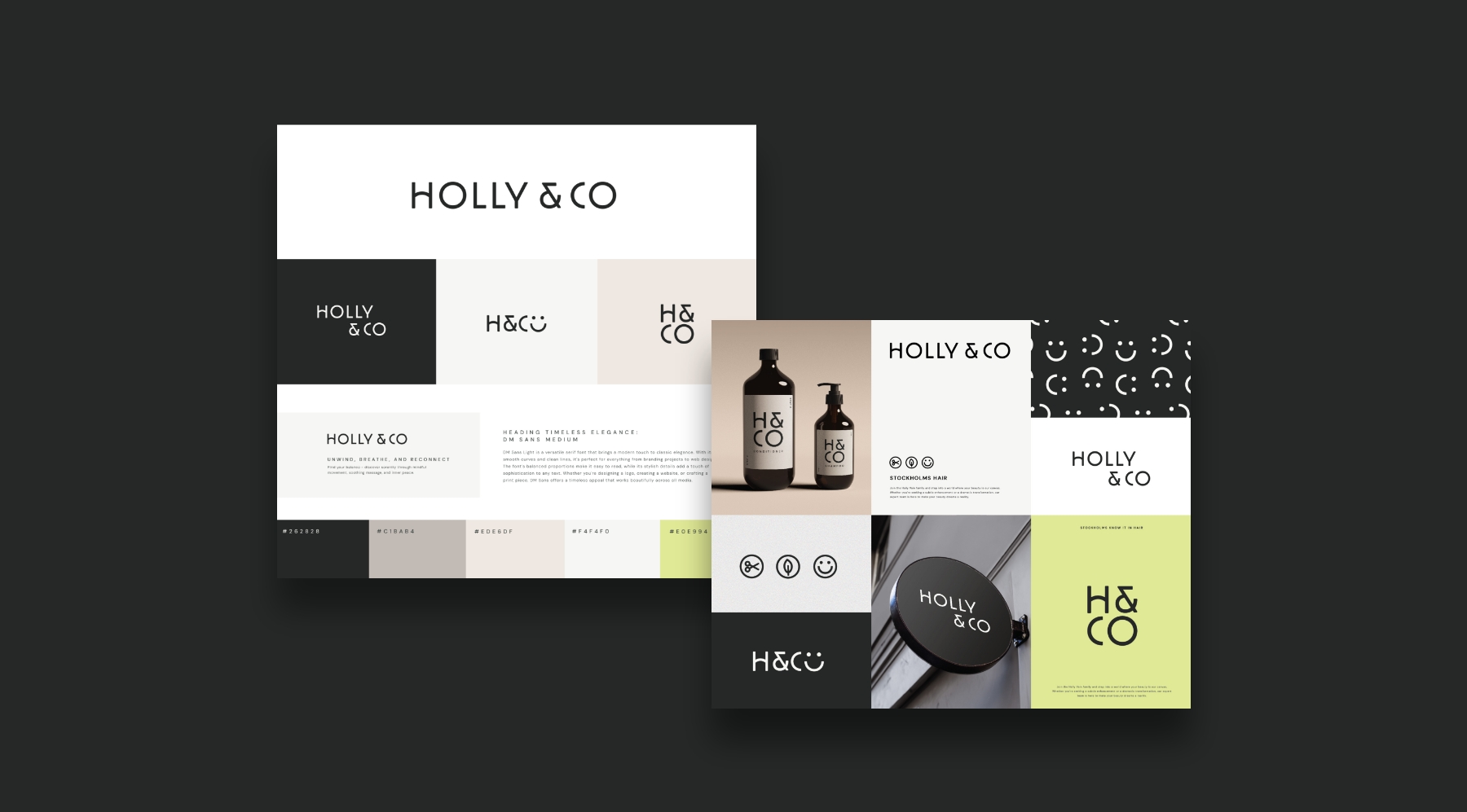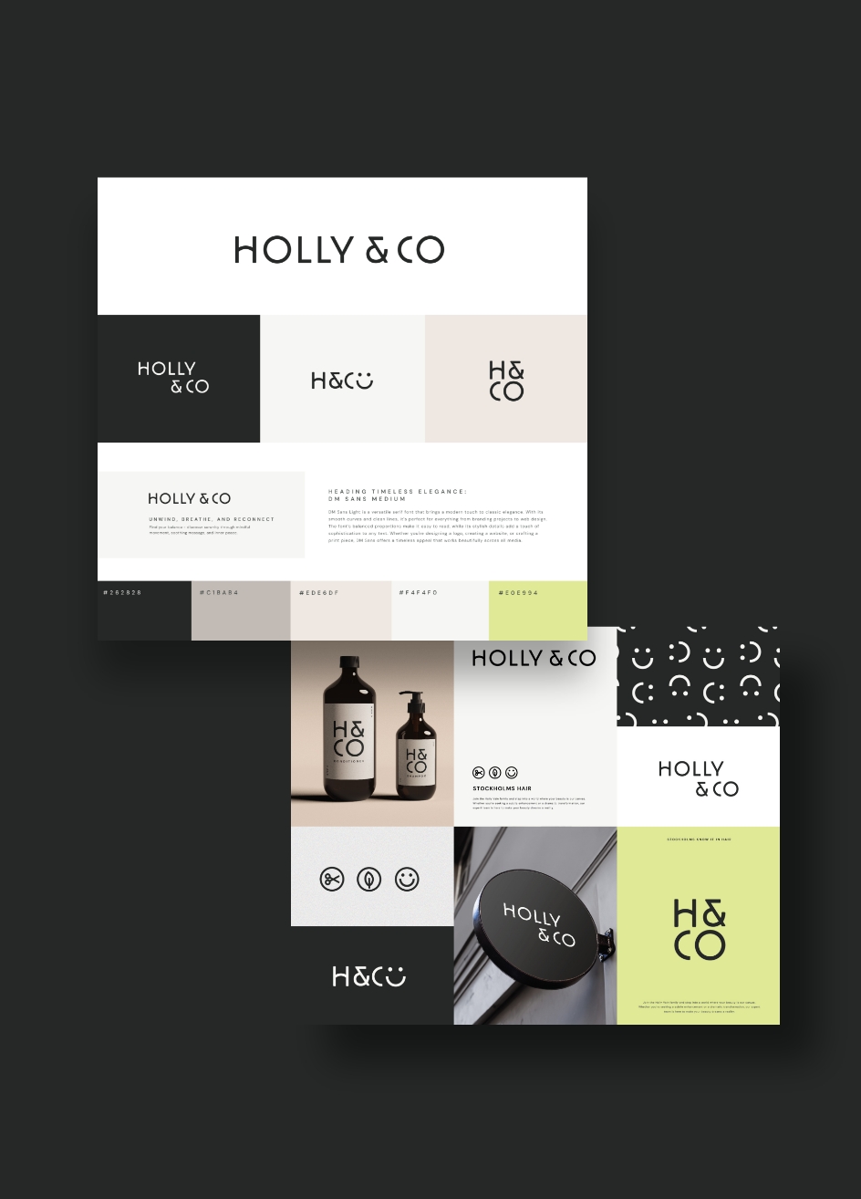 Holly & Co is a trendy hair salon brand that blends sleek, modern design with bold, vibrant, playful energy. The logo features clean, stylish lines that give a contemporary feel, paired with a striking colour palette of dark grey, vanilla white, and a vibrant yellow-green, which brings a fresh and dynamic vibe to the brand.